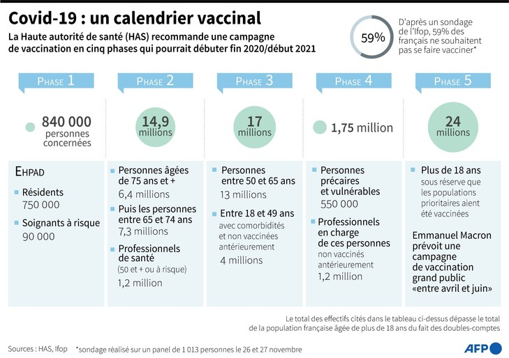 La phase 1 commence en janvier, et février. La phase 2 pourrait débuter en février si l’on a assez de vaccin. La phase 3 est prévue en mars, la phase 4 au printemps, et la phase 5, majorité de la population jeune et en bonne santé avant l’été.