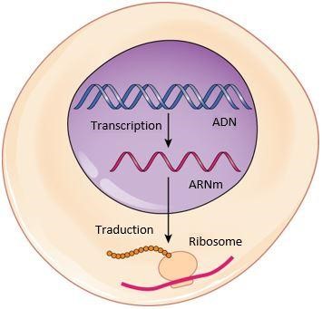 Il sort du noyau, emportant le message, et se rend dans un autre constituant cellulaire, le ribosome, chargé de diffuser le message de l’ARNm aux exécutants