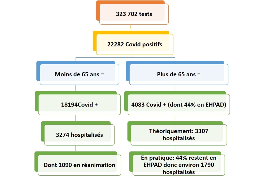 - 81 % des hospitalisés ont plus de 65 ans. Donc si tous ceux dont l’état nécessitait une hospitalisation, en moyenne 3307 patients de plus de 65 ans seraient hospitalisés.