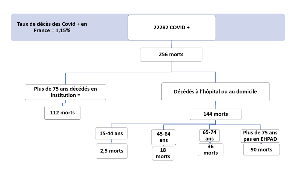 Le chiffre à retenir est le taux de mortalité des gens atteints par le Coronavirus. Il estimé par l’OMS, en France à 1,15% des personnes atteintes, les 2/3 ayant plus de 65 ans